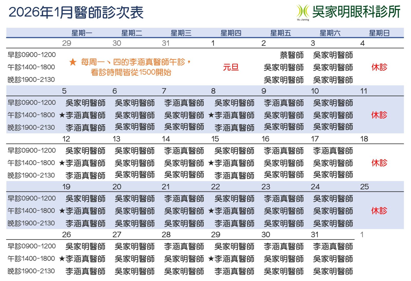 圖為115年1月份「吳家明眼科」醫師診次表,若臨時有微幅異動,以現場公告為主